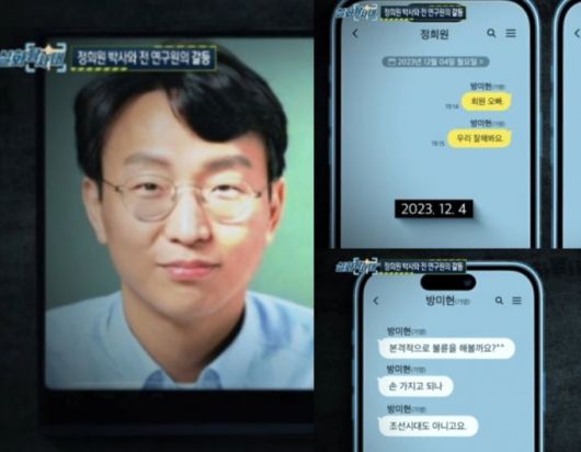 '저속노화' 열풍을 이끈 노년내과 전문의 정희원 박사가 전 진장 여자 연구원 A씨에게 스토킹 피해를 입었다고 주장하며 2년간의 대화 내용을 공개했다. /사진=MBC '실화탐사대' 방송화면 |