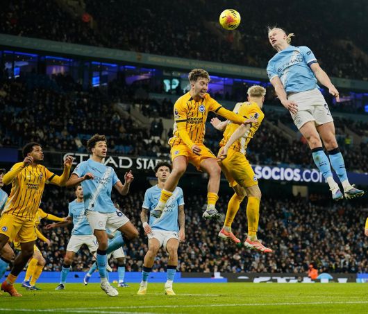 잉글랜드 프리미어리그(EPL) 맨체스터시티(맨시티)의 ‘괴물 공격수’ 엘링 홀란(오른쪽)이 8일 열린 브라이턴 앤드 호브 앨비언과의 안방경기에서 높게 뛰어올라 헤더를 시도하고 있다. 전반 41분 페널티킥으로 선제골을 터뜨린 홀란은 시즌 20번째 골이자 맨시티 통산 150번째 골을 기록했다. 이 골은 또 EPL 역사상 3만5000번째 골로 기록됐다. EPL 득점 선두인 홀란은 유럽 5대 리그 중 가장 먼저 20호 골을 달성했다. 경기는 1-1로 비겼다.