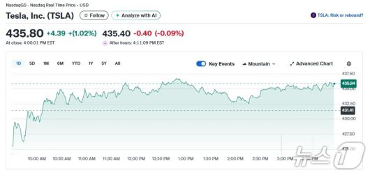 일단 테슬라는 1.02% 상승한 435.80달러로 장을 마감했다.