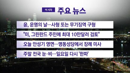 ■ 윤, 운명의 날…사형 또는 무기징역 구형 ■ "미, 그린란드 주민에 최대 10만달러 검토" ■ 오늘 안성기 영면…명동성당에서 장례 미사 ■ 주말 전국 눈·비…일요일 다시 '한파' [저작권자(c) YTN 무단전재, 재배포 및 AI 데이터 활용 금지] 대한민국 24시간 뉴스채널 [YTN LIVE] 보기 〉 [YTN 단독보도] 모아보기 〉