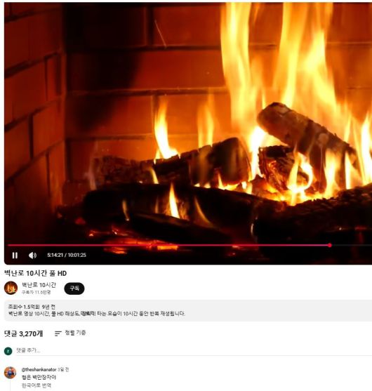 지난 2016년 10월 2일 게시한 영상인데, 영상 제목도 ‘Fireplace 10 hours full HD’ (벽난로 10시간 풀HD)다.