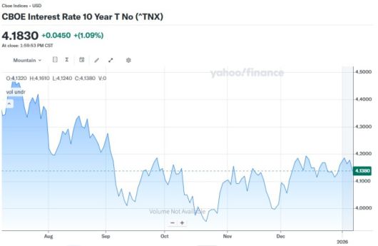 미 국채 10년물 금리 차트, 자료-야후 파이낸스, 2026.01.09 koinwon@newspim.com |