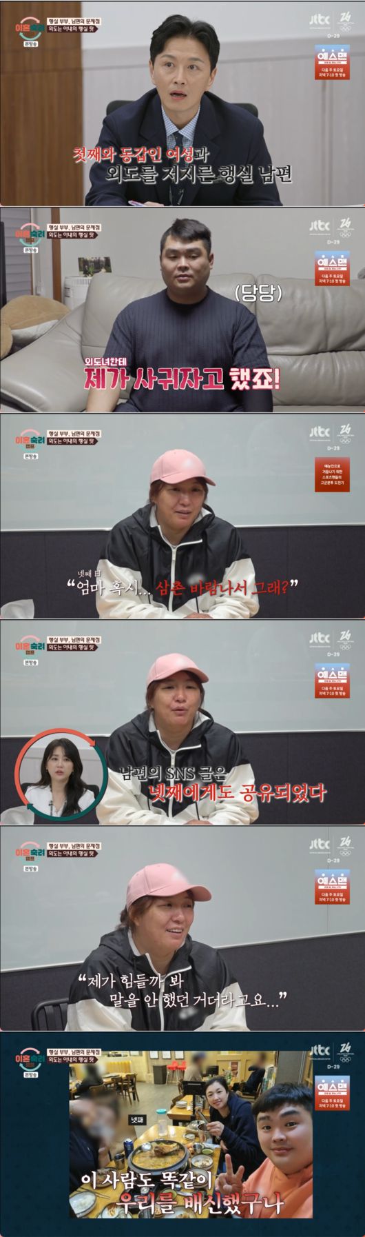아내는 남편이 현재 "첫째 딸 나이와 동갑인 24살 여성과 바람이 났다"고 폭로해 스튜디오를 경악케 했다. 더욱 놀라운 것은 남편이 외도녀에게 본인이 직접 사귀자고 먼저 제안했다며 사실을 당당하게 인정했다는 점이다. 아내는 결혼식을 올린 지 불과 2주 만에 남편의 외도 사실을 알게 되었으며, 이미 남편의 SNS는 이혼 선언과 외도 정황으로 가득 차 있었다.