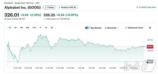 8일(현지 시각) 뉴욕증시에서 알파벳은 1.10% 상승한 326.01달러를 기록했다. 이로써 시총도 3조9350억달러로 늘어 4조달러 돌파를 눈앞에 두고 있다.