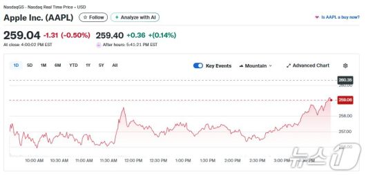 8일(현지 시각) 뉴욕증시에서 애플은 0.50% 하락한 259.04달러를 기록했다. 이로써 시총도 3조8440억달러로 줄었다.