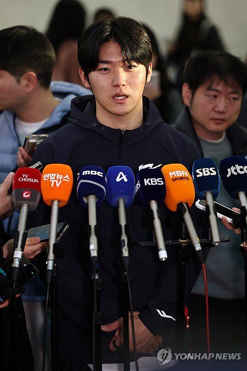 (영종도=연합뉴스) 윤동진 기자 = 한국 야구대표팀 김도영이 9일 인천국제공항 1터미널에서 월드베이스볼클래식(WBC) 1차 캠프지인 사이판 출국에 앞서 취재진과 인터뷰를 하고 있다. 2026.1.9