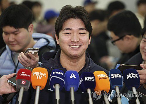 (영종도=연합뉴스) 윤동진 기자 = 한국 야구대표팀 고우석이 9일 인천국제공항 1터미널에서 월드베이스볼클래식(WBC) 1차 캠프지인 사이판 출국에 앞서 취재진과 인터뷰를 하고 있다. 2026.1.9