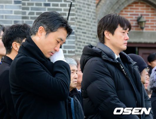 운구를 맡은 배우 조우진, 유지태가 장례 미사를 마치고 영결식장으로 이동하고 있다. 2026.01.09 /jpnews@osen.co.kr