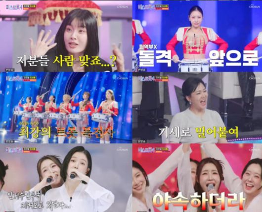 몰표가 쏟아지기도 했다. 현역부A와 타장르부A는 정통 트롯A로 맞붙었다. 현역부A는 마스터 예심 진 이소나, 베이시스트 트롯퀸 장혜리, 10kg 감량하고 돌아온 김혜진, 넥스트 심수봉 김산하, '미스트롯' 사수생 정혜린, 트롯 선샤인 최지예 등 현역 경력만 도합 36년인 드림팀. 타장르부A는 '오빠야' 원곡자 신현희, 소트라노 박홍주, 트롯 아이유 백예슬, 몽골 소녀 엑식렝 등 멤버 전원 올하트로 뭉쳤다.
