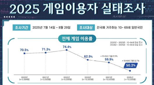 한국콘텐츠진흥원이 최근 발표한 '2025 게임이용자 실태조사'에 따르면 지난 1년간 게임 이용률은 50.2%로 집계됐다. 최근 3년 연속 감소세다. 조사가 시작된 2015년 이후 최저치다.
