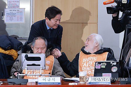 (서울=연합뉴스) 신현우 기자 = 더불어민주당 김영배 의원이 9일 국회의원회관에서 열린 민주당-전국장애인차별철폐연대 간담회에 참석하며 박경석 전장연 대표와 인사하고 있다. 2026.1.9
