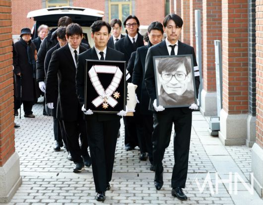 고인의 영정과 금관문화훈장은 배우 이정재와 정우성이 운반하며, 운구는 설경구, 유지태, 박철민, 조우진, 주지훈 등 후배들이 맡았다. 장례 미사와 영결식을 마친 뒤 운구 행렬은 서울추모공원으로 이동하며, 고인은 장지인 양평 별그리다에서 영면에 든다.