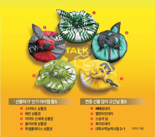 최고 인기 선물은 전년과 마찬가지로 스타벅스 상품권이었다. 2위는 배달의민족 상품권이 선정됐다. 이어 이마트·신세계, 올리브영, 투썸플레이스 상품권 순이었다. 선물하기 코너에서 유통된 브랜드는 8700여개로 64만종 상품이 유통됐다.