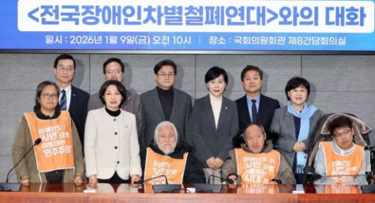 김영배, 서영교, 전현희, 박주민, 박홍근 등 더불어민주당 의원들과 박경석 전장연 상임대표 등 참석자들이 9일 국회 의원회관에서 열린 전국장애인차별철폐연대와의 대화에서 기념촬영하고 있다. 2026.1.9 김현민 기자 |