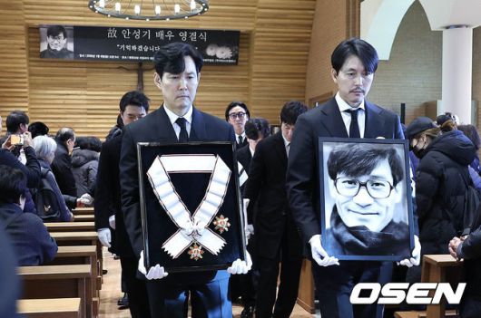 배우 정우성, 이정재가 영정과 금관문화훈장을 들고 운구 행렬과 영결식장을 나서고 있다. 2026.01.09 / photo@osen.co.kr