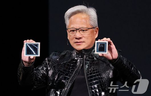 젠슨 황 엔비디아 최고경영자(CEO)가 5일(현지시간) 미국 네바다주 라스베이거스 퐁텐블루에서 열린 엔비디아 CES 2026 라이브에서 기조연설을 하던 중 AI 칩을 들어올리고 있다. (공동취재) 2026.1.6/뉴스1 ⓒ News1 황기선 기자 |