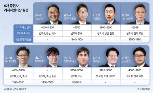 유종우 센터장은 코스피 밴드 상단을 9개 증권사 중 가장 높은 5650으로 제시했다. 가장 낮은 상단을 제시한 이는 윤석모 삼성증권 리서치센터장(4900)이었다.