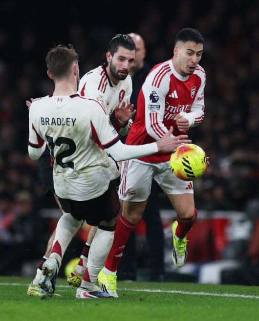 Soccer Football - Premier League - Arsenal v Liverpool - Emirates Stadium, London, Britain - January 8, 2026 Liverpool's Conor Bradley and Dominik Szoboszlai in action with Arsenal's Gabriel Martinelli Action Images via Reuters/Paul Childs EDITORIAL USE ONLY. NO USE WITH UNAUTHORIZED AUDIO, VIDEO, DATA, FIXTURE LISTS, CLUB/LEAGUE LOGOS OR 'LIVE' SERVICES. ONLINE IN-MATCH USE LIMITED TO 120 IMAGES, NO VIDEO EMULATION. NO USE IN BETTING, GAMES OR SINGLE CLUB/LEAGUE/PLAYER PUBLICATIONS. PLEASE CONTACT YOUR ACCOUNT REPRESENTATIVE FOR FURTHER DETAILS..<저작권자(c) 연합뉴스, 무단 전재-재배포, AI 학습 및 활용 금지> |