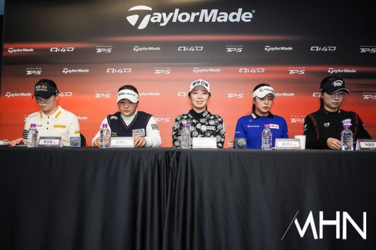팀 테일러메이드 방신실, 유해란, 김수지, 윤이나, 이동은이 기자회견장에서 질문에 답변 하고 있다.