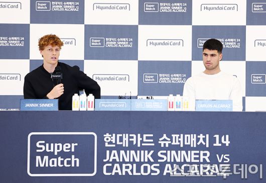 [스포츠투데이 권광일 기자] 테니스 세계 랭킹 1,2위 카를로스 알카라스와 야닉 시너가 9일 오후 서울 영등포구 여의도 현대카드 본사에서 열린 현대카드 슈퍼매치 14 야닉 시너와 카를로스 알카라스의 기자회견에 참석하고 있다. 2026.01.09. [스포츠투데이 권광일 기자 sports@stoo.com]