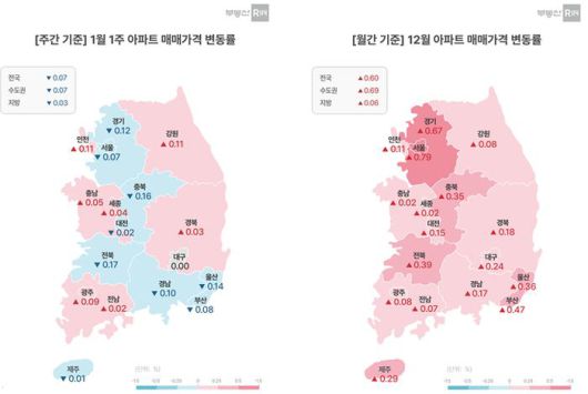 9일 부동산R114에 따르면 1월 첫째 주 서울 아파트 매매가격은 0.07% 하락했다. 서울과 수도권 모두 0.07% 떨어졌고 경기·인천이 -0.08% 변동률을 나타냈다. 비수도권은 5대 광역시가 -0.03%, 기타 지방이 -0.02%로 약세를 보였다. 계절적 영향에 따른 뜸한 부동산 거래가 시세 하락으로 이어진 것으로 해석된다.