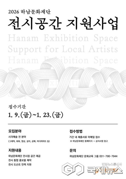 (하남=국제뉴스) 강정훈 기자 = 하남문화재단(이사장 이현재)이 하남시를 기반으로 시각예술 분야에서 활동하는 지역 예술가를 지원하기 위해 <전시공간 지원사업> 참여 작가를 오는 23일까지 모집한다고 밝혔다.