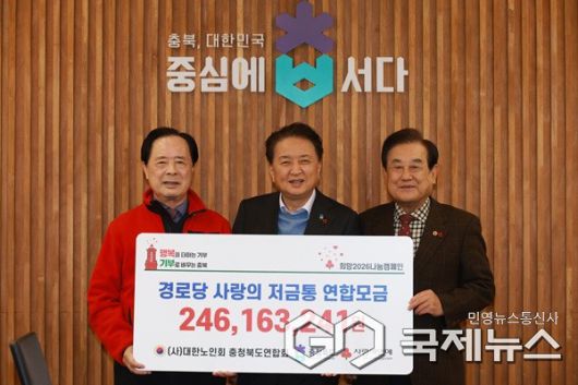 (청주=국제뉴스) 이상석 기자 = 충북도는 9일 도청 여는마당에서 (사)대한노인회 충북연합회가 도내 경로당 4098개소에서 사랑의 저금통을 통해 모금한 성금 2억4600여만 원을 충북사회복지공동모금회에 기탁했다고 밝혔다.