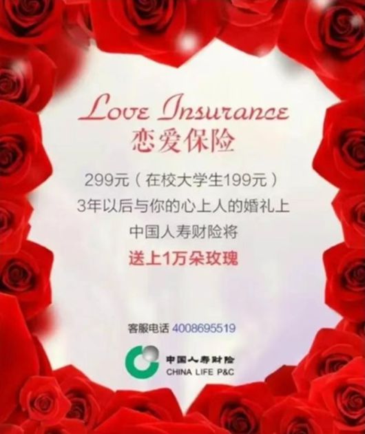 이 연애보험은 출시 당시 중국 젊은 층 사이에서 큰 화제를 모은 상품이었다. 중국 대형 보험사인 인수보험과 알리페이 산하 보험사가 공동으로 기획했으며 장미 지급형, 현금 지급형, 다이아몬드 반지 지급형 등 여러 형태로 판매됐다. 가입 후 3년이 지나고 10년 이내에 지정한 상대와 혼인 신고를 하면 보상이 이뤄지는 방식이었다.