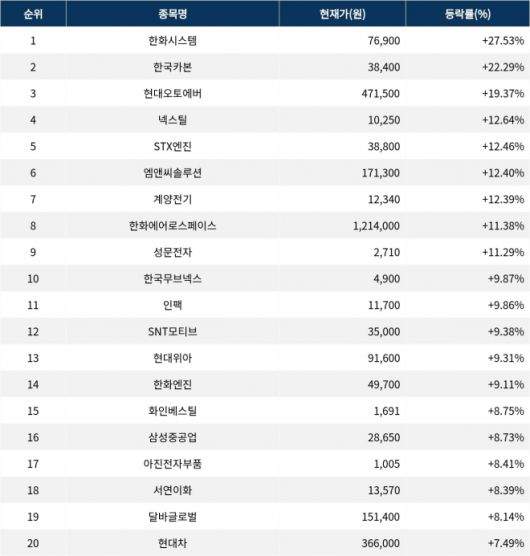 이밖에도 인팩(023810) ▲9.86%, SNT모티브(064960) ▲9.38%, 현대위아(011210) ▲9.31%, 한화엔진(082740) ▲9.11%, 화인베스틸(133820) ▲8.75%, 삼성중공업(010140) ▲8.73%, 아진전자부품(009320) ▲8.41%, 서연이화(200880) ▲8.39%, 달바글로벌(483650) ▲8.14%, 현대차(005380) ▲7.49% 등을 기록하며 금일 증시를 상승으로 마감했다.
