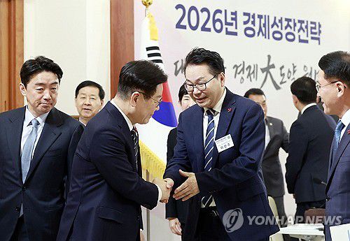 (서울=연합뉴스) 한상균 기자 = 이재명 대통령이 9일 청와대에서 경제성장전략 국민보고회 후 이한주 경제인문사회연구회 이사장과 인사하고 있다. 2026.1.9 [청와대통신사진기자단]