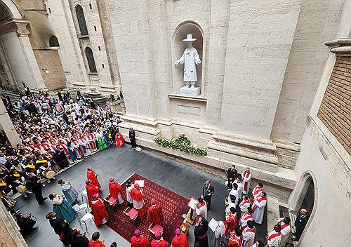 도포를 입고 갓을 쓴 모습의 24세 청년 김대건 신부를 표현한 높이 3.7m의 이 석상은 2023년 9월 바티칸의 성 베드로 대성전 외부 벽감에 설치됐다.