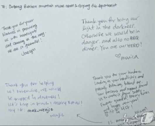 북한산에서 조난 위기에 처했던 싱가포르 관광객들이 자신들을 구해준 119 산악구조대원들에게 귀국 후 감사 편지를 보냈다.