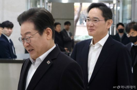 (서울=뉴스1) 김민지 기자 = 이재명 더불어민주당 대표와 이재용 삼성전자 회장이 20일 오전 서울 강남구 삼성 청년 소프트웨어 아카데미(SSAFY)에서 열린 청년 취업 지원을 위한 현장 간담회에 참석하기 위해 이동하고 있다. (공동취재) 2025.3.20/뉴스1 Copyright (C) 뉴스1. All rights reserved. 무단 전재 및 재배포, AI학습 이용 금지. /사진=(서울=뉴스1) 김민지 기자