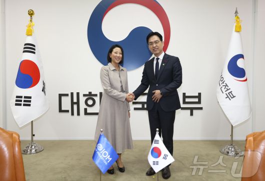 (서울=뉴스1) = 김민재 행정안전부 차관이 9일 오후 서울 종로구 정부서울청사에서 이성아 국제이주기구(IOM) 사무차장과 면담에 앞서 기념촬영을 하고 있다.(행정안전부 제공. 재판매 및 DB금지) 2026.1.9/뉴스1kinam@news1.krCopyright ⓒ 뉴스1. All rights reserved. 무단 전재 및 재배포, AI학습 이용 금지.