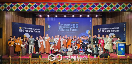 (부탄=국제뉴스) 유지현 기자 = 9일 부탄 팀푸시 왕립대학교(RUB)에서 열린 제2회 부탄 국제 ESG 동맹포럼(The 2nd Bhutan International ESG Alliance Forum) 중 기념촬영을 하는 참가자들.