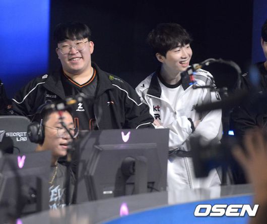 [OSEN=종로, 고용준 기자] 9일 오후 서울 종로 롤파크 LCK아레나에서 '2026 LoL 시즌 오프닝: 데마시아를 위하여' 가 열렸다. 시즌 오프닝 첫 번째 순서인 ‘대진표 결정 미니 게임’에 나선 선수들을 지켜보고 있는 ‘딜라이트’ 유환중과 ‘고스트’ 장용준이 활짝 웃고 있다. / scrapper@osen.co.kr