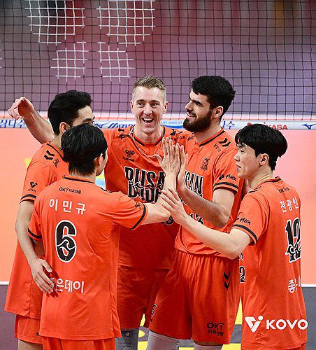 OK저축은행은 9일 부산 강서체육관에서 열린 진에어 2025-2026 V리그 홈경기에서 17점을 뽑은 외국인 주포 디미타르 디미트로프(등록명 디미트로프)를 앞세워 현대캐피탈을 세트 점수 3-0(25-20 26-24 25-18)으로 완파했다. 사진은 이날 경기에서 득점한 뒤 기뻐하는 OK저축은행 선수들. 2026.1.9 [한국배구연맹 제공. 재판매 및 DB 금지]