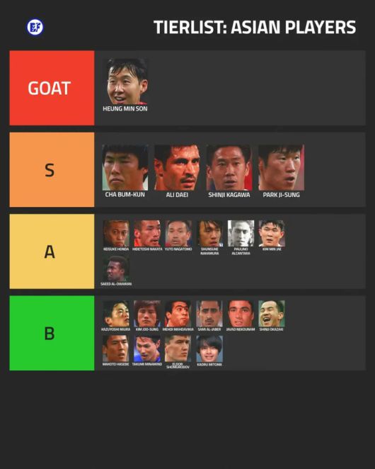 S등급에는 차범근과 박지성을 비롯해 알리 다에이(이란), 카가와 신지(일본)가 포함됐다. 한국 축구 팬들 사이에서 '손차박'으로 불리며 세계 무대에서 정상급 활약을 펼친 차범근과 박지성은 S등급에 충분히 어울리는 평가다. 다에이는 이란 대표팀에서 A매치 148경기 108골을 기록하며 역대 득점 순위 3위에 올라 있고, 카가와 역시 2011-12 시즌 보루시아 도르트문트에서의 활약을 바탕으로 분데스리가 베스트 11에 선정된 바 있다. 다만 그 아래 등급 구성에는 물음표가 따른다.