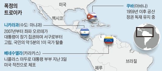 2018년 도널드 트럼프 1기 행정부는 중남미 대표 강경 반미(反美)·좌파 성향 국가인 베네수엘라·니카라과·쿠바를 묶어 ‘폭정의 트로이카(troika of tyranny)’라고 규정했다. 미국이 지난 3일 베네수엘라 니콜라스 마두로 정권을 축출하며 트로이카의 한 축을 무너뜨리자, 니카라과와 쿠바의 향후 상황이 주목받고 있다. 실제로 쿠바와 니카라과 정권 수뇌부는 긴장 속에 향후 상황을 주시하는 것으로 알려졌다.