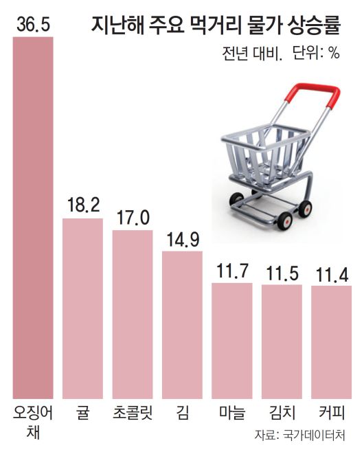 지난해 가공식품 중에선 오징어채 값이 1년 새 36.5% 상승했다. 국내에서 파는 오징어채 상당수가 페루산 오징어를 원료로 쓰는데 페루의 오징어 생산량이 줄어든 영향이 컸다. 이어 초콜릿(17.0%), 양념소스(14.8%), 김치(11.5%), 커피(11.4%) 등이 두 자릿수 물가 상승률을 보였다. 데이터처 관계자는 “2024년 말부터 원재료와 인건비 상승을 이유로 식품업체들이 가공식품 가격을 줄줄이 올렸기 때문”이라고 설명했다.