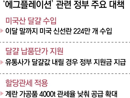 달걀 한 판 가격은 지난해 상반기(1∼6월) 4년 만에 처음으로 7000원을 넘어서며 에그플레이션 우려가 커지기 시작했다. 정부는 산지 가격을 고시하는 사업자단체 대한산란계협회에 조사관 등을 보내 현장 조사를 하는 등 가격 인하에 나섰다. 농림축산식품부에선 가공식품 원료육(돼지고기)과 제과·제빵용으로 사용되는 달걀 가공품에 대해 할당관세(무관세)를 적용하는 등 대책을 내놨다. 지난해 11월 평균 가격은 6499원까지 떨어졌다.