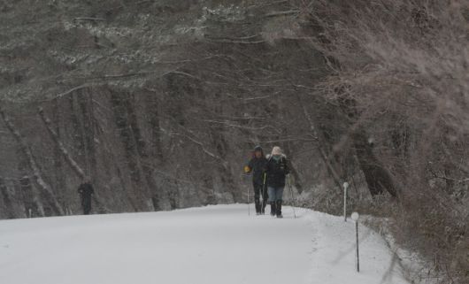 제주도 산지에 대설특보가 발효된 지난 2일 오전 제주시 1100도로를 찾은 탐방객들이 눈 쌓인 도로 위를 걸어가고 있다. (사진=뉴시스) |