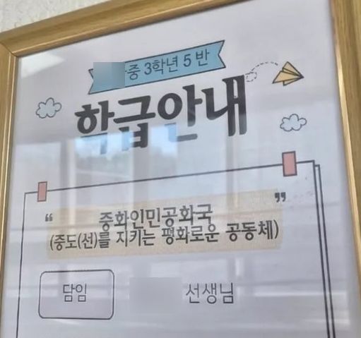 사진 속 급훈에는 '중화인민공화국'이라는 문구가 적혀 있고, 그 아래에 '중도(선)을 지키는 평화로운 공동체'라는 설명이 덧붙어 있다.