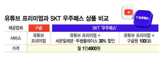 10일 업계에 따르면 현재 SK텔레콤의 구독 서비스 우주패스에는 유튜브 프리미엄 단독 이용 요금인 월 1만4900원과 동일한 가격에 월 구독료 이상의 할인을 받을 수 있는 가성비 좋은 상품들이 있다.