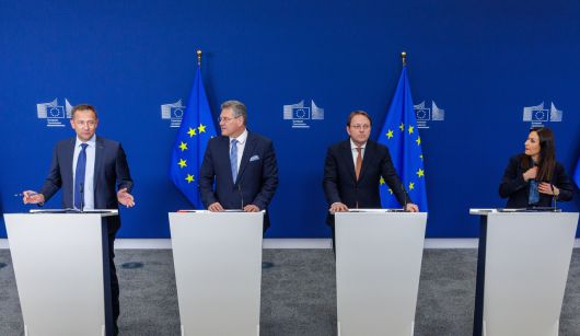 유럽 농업 및 식량 담당 집행위원 크리스토프 한센, 유럽 무역 및 경제 안보 담당 집행위원, 마로스 세프코비치, 유럽 보건 및 동물 복지 담당 집행위원 올리버 바르헬리, 키프로스 농업, 농촌 개발 및 환경부 장관 마리아 파나이오투가 지난 7일(현지시간) 벨기에 브뤼셀에서 열린 유럽연합(EU) 농업 장관 회의 후 기자회견에서 연설하고 있다. [EPA] |