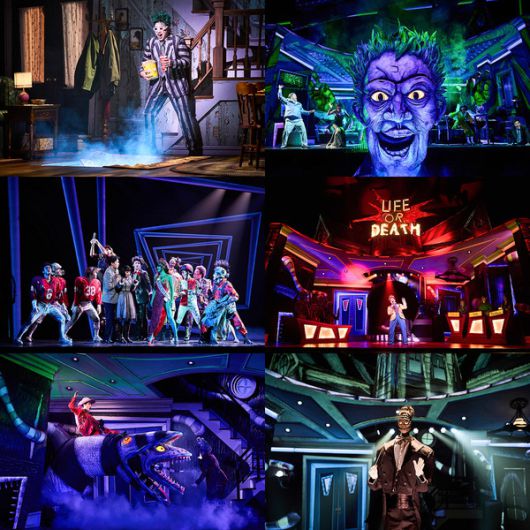 '디테일 맛집'다운 면모를 보여주는 한편 압도적인 스케일의 무대 장치와 퍼펫은 뮤지컬 <비틀쥬스>를 '환상의 테마파크'로 완성하는 일등 공신이다. 토니 어워즈 무대 디자인상 노미네이트에 빛나는 데이비드 코린스의 무대는 마술상자처럼 시시각각 변화하며 시각적 쾌감을 선사한다. 모든 세트는 프린트가 아닌 '핸드 페인팅' 방식으로 제작되어 팀 버튼 특유의 질감을 완벽히 구현했다.