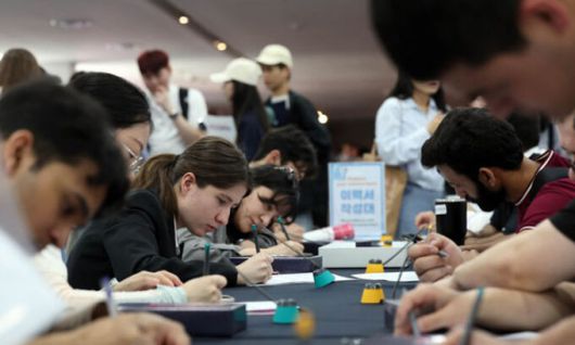 지난 2024년 5월 23일 오후 부산 해운대구 영화의전당 비프힐에서 외국인 유학생들이 이력서를 작성하고 있다. 뉴시스 |