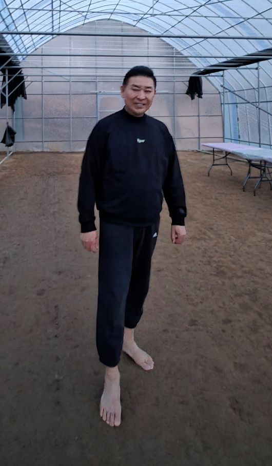 1월 7일 경기도 남양주시 퇴계원로175번길, 헤브론교회 앞 ‘맨발 걷기 아미사 힐링하우스’. 유제성 삐땅기의원성형외과 원장(73)은 섭씨 영하의 날씨인 가운데 아내인 문정희 삐땅기의원성형외과 대표와 함께 즐겁게 맨발로 걸었다. 추위를 막기 위해 설치한 비닐하우스 덕분에 영하의 날씨는 전혀 문제가 되지 않았다. 5년 전 걷기에 빠진 유 원장은 3년 전 맨발로 걷는 문 대표의 영향으로 자연스럽게 맨발 걷기를 접했고, 지금은 환자들에게도 자연스럽게 맨발 걷기를 권하고 있다.