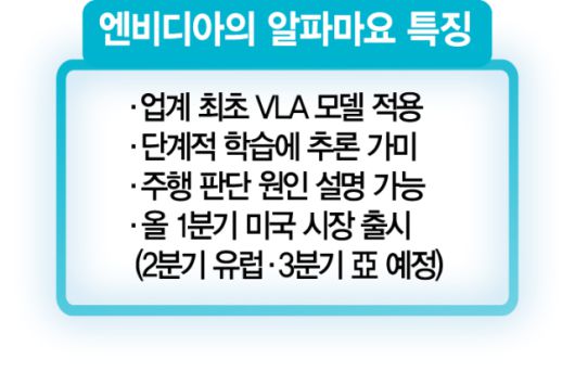 황 CEO는 이같은 한계를 극복하기 위해 단계별 사고와 추론에 기반한 업계 최초의 ‘비전 언어행동(VLA)’ 모델을 고안했다고 설명했다. 이 모델은 AI가 그간 학습하지 못한 상황과 마주할 때 추론을 하고 행동한다. 전방에 횡단보도를 건너는 보행자가 보이면 우회전이 낫다고 판단하거나 공이 도로에 굴러오면 아이가 따라올 가능성에 대비해 멈추는 식이다. 황 CEO는 “피지컬 AI(AI와 물리적 세계를 결합한 기술)의 챗GPT 시대가 도래했다”며 “알파마요를 탑재한 메르세데스벤츠 CLA를 올 1분기에 미국에서 먼저 출시하고, 2∼3분기에는 유럽과 아시아 시장에도 내놓을 것”이라고 예고했다. CNBC는 이날 “엔비디아는 2028년까지 일반 승용차가 목적지까지 갈 수 있는 자율주행 기능을 구현하는 것을 목표로 삼고 있다”고 보도했다.