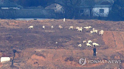 (인천=연합뉴스) 임순석 기자 = 10일 인천 강화군 강화평화전망대에서 바라본 북한 황해북도 개풍군에서 주민이 염소를 돌보고 있다.